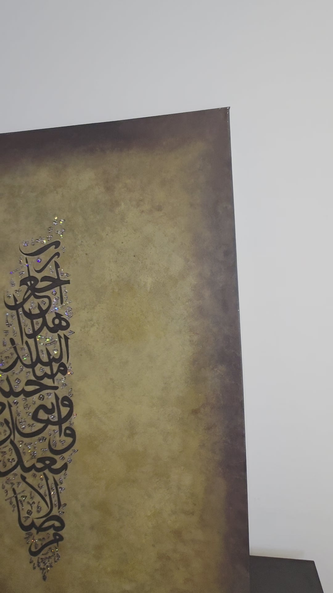 The background is painted in layered shades of brown and beige, creating an antique, earthy texture reminiscent of aged parchment or ancient walls — a nod to deep roots and enduring history. Over 200 Swarovski crystals in subtle tones are delicately embedded throughout the design, adding a refined shimmer that glows softly without overpowering the message.