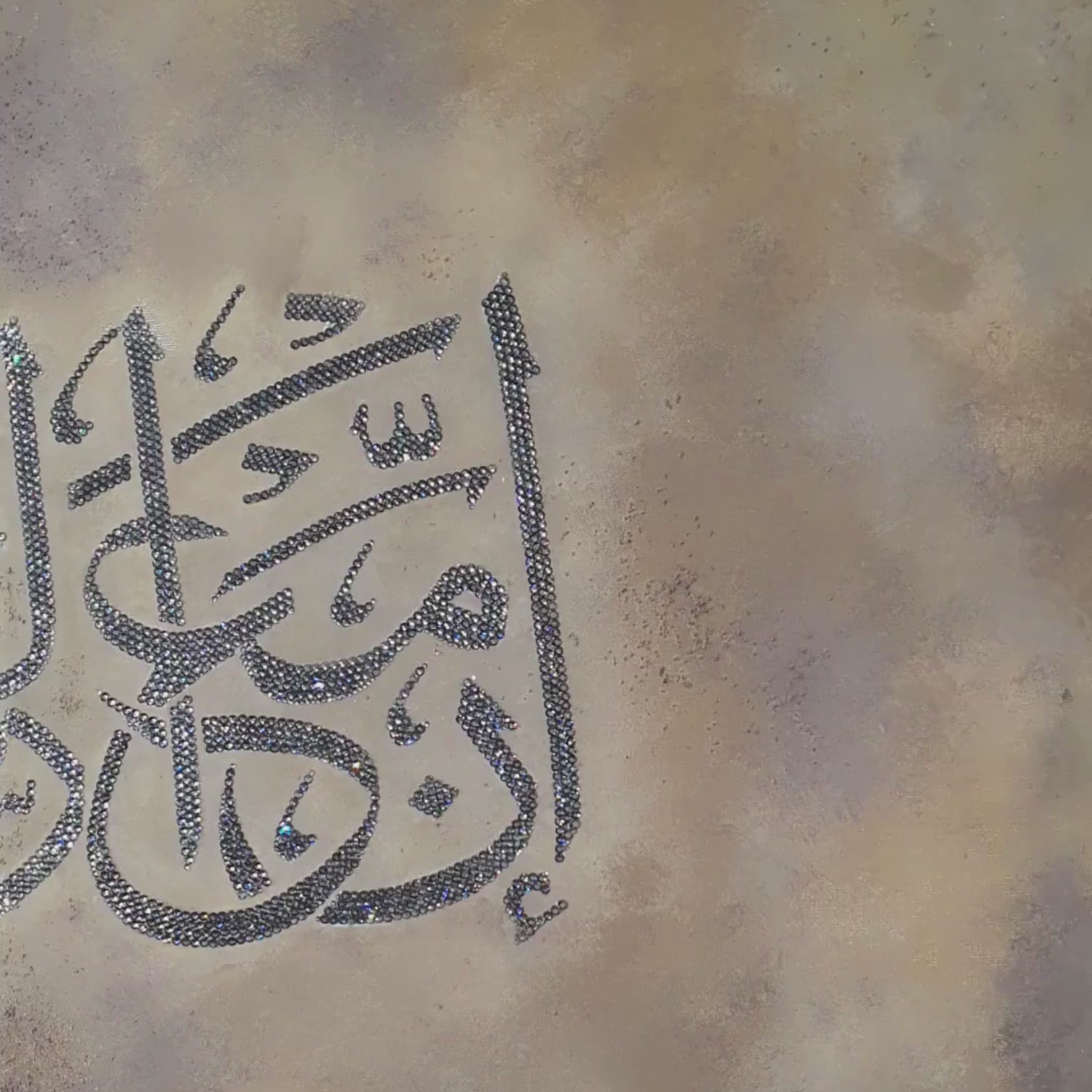 Set against a warm, textured background of tan, beige, and soft brown hues, the sacred verse “Inna ma‘al usri yusra” (Surah Ash-Sharh, 94:6) is brought to life with over 500 greige-toned Swarovski crystals, creating a soft, sophisticated sparkle that catches the light without overwhelming the calm, grounded palette.