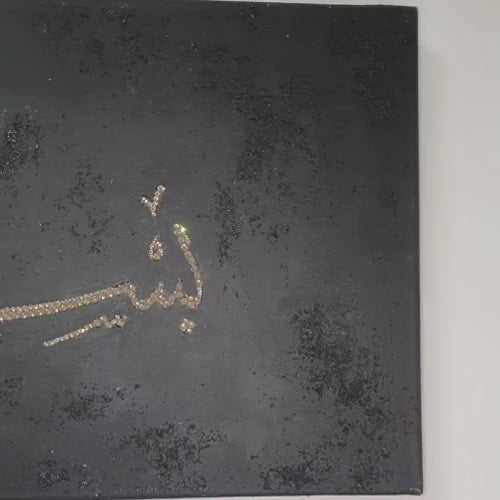 A stunning fusion of faith, luxury, and craftsmanship, this handcrafted canvas is a bold yet graceful expression of Islamic devotion. Set against a rich, textured black background, the sacred phrase "Bismillah-ir-Rahman-ir-Raheem" (In the name of Allah, the Most Gracious, the Most Merciful) is brought to life in shimmering detail.